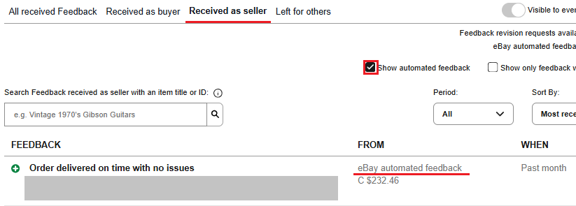 そして、評価欄には「eBay automated feedback」(eBayの自動フィードバック)という表示がされるため、バイヤーが残した評価との区別がはっきりと分かるようになっています。